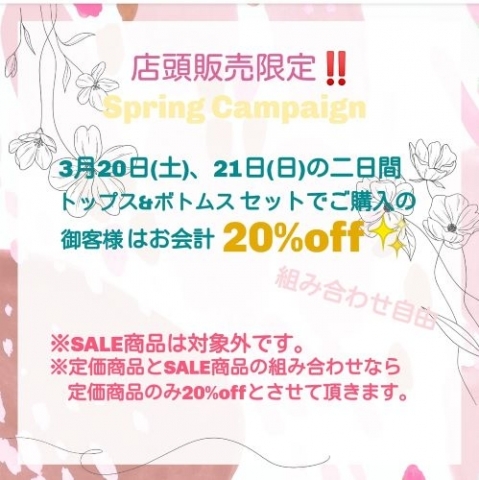 組み合わせ自由でトップス&ボトムスの定価商品をセットでお買い上げのお客様は20%offの