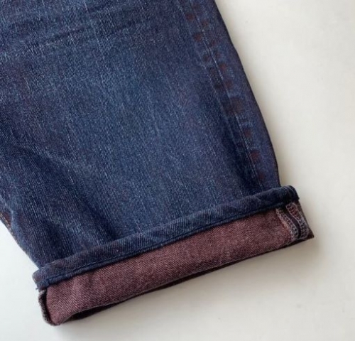 白い緯糸面が多い裏側の生地は特にベンガラの赤が鮮明に出ているので、少しロールアップした