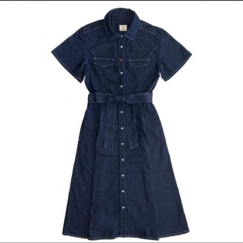 一つだけ赤いスナップボタンが可愛く、どこか懐かしいデザインのワンピース。