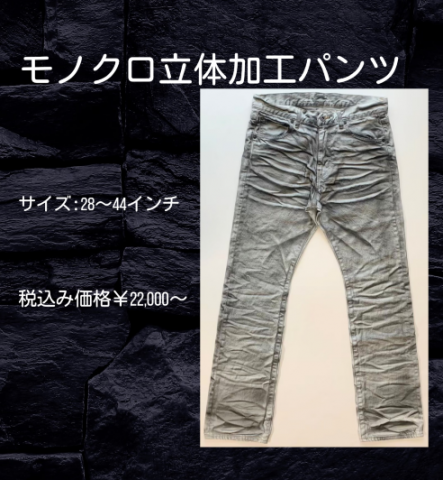 サイズ:28~44インチと、広いサイズ展開でも人気のモノクロ立体加工のメンズジーンズです。