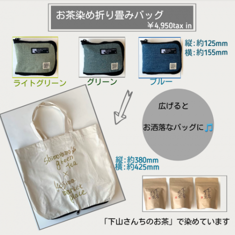 岡山県美作市の「下山さんちのお茶」で染めた折りたたみバッグです。