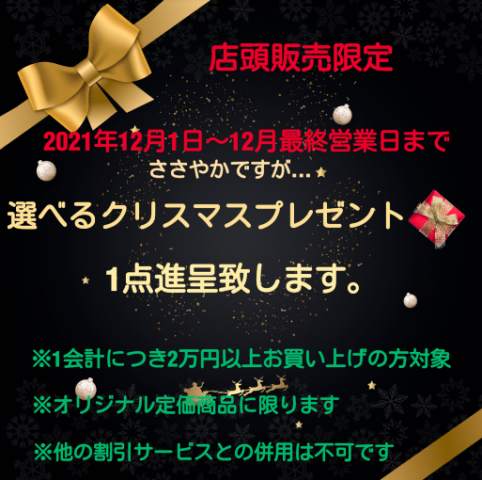 2021年12月1日から本年最終営業日までの期間中、1会計2万円以上のお買い上げで 「選べるクリスマスプレゼント」を1点進呈致します