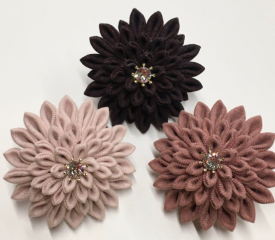ベンガラ染めデニムで作った、つまみ細工のダリアブローチです。