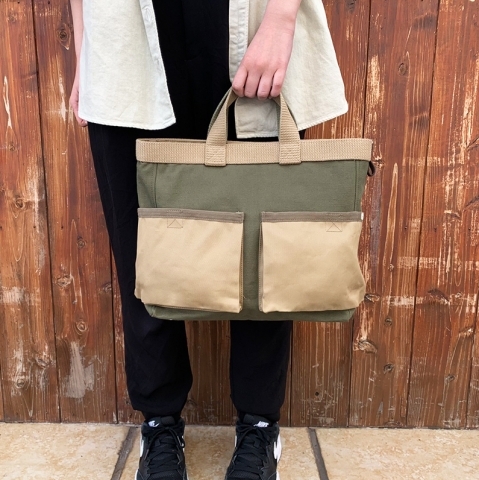 カーキ部分にはキャンパス生地、ベージュ部分にはバックサテン生地を使用