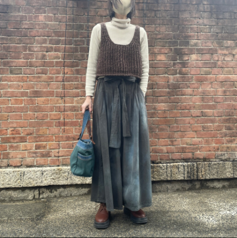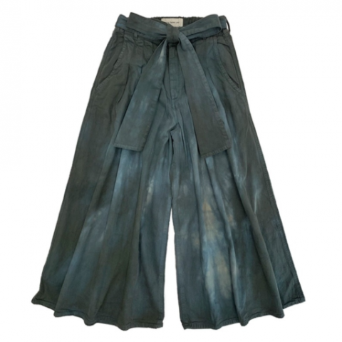 グリーンやブラウンが複雑に交わりあう個性的なカラーのリボンキュロット。
