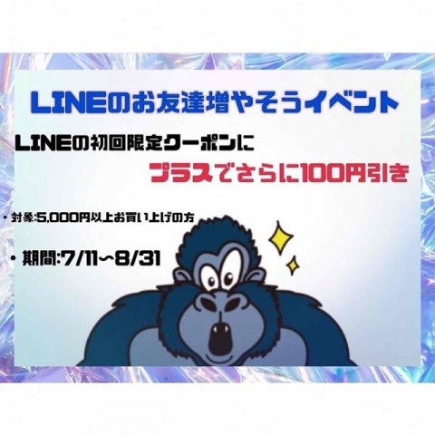 ¥5,000以上お買い上げで、初めてLINEのお友達になって下さったお客様に、通常¥500引きのところ…さらにプラス¥100引き