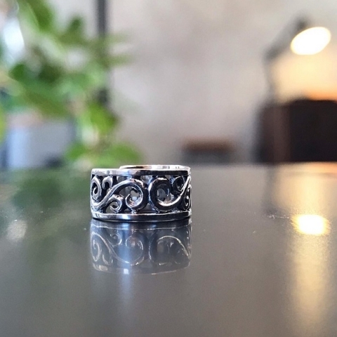 透かしと燻し加工により、立体感のあるヴァインが耳元で強い存在感を放ちます。