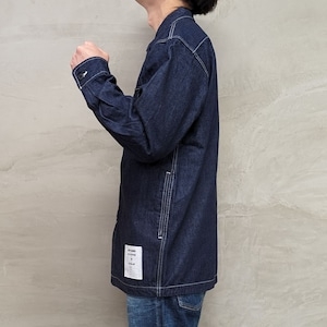背中部分にはNO BLUEのブランドロゴを刺繍でデザインしたり、フロント部分の“デカタグ”など、トリプルコラボレーションに相応しいインパクト抜群なデザインも健在。少しゆったりめのシルエットで、あると嬉しいサイドポケットはもちろんのこと、裏側には巨大な内ポケットを搭載するなど、「NO BLUE」ならではのこだわりの詰まったデニムシャツです。