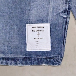 NO BLUE待望のデニムアイテムとなった本アイテムは、BLUE SAKURA厳選の10オンスオリジナルデニムを採用。洗い加工ではストーンを一切使用せず、水を大幅に削減したNANO MISTウォッシュを用いて、見た目とは裏腹に環境に優しいサステイナブル加工を実現。全体に施されている擦り切れダメージや、ハンドメイドによるこだわりのリメイク等は、経験豊富な岡山のデニム職人がひとつひとつ大胆にも丁寧な加工で仕上げています。