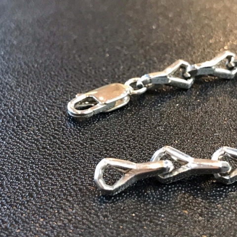 留め具はチェーンを邪魔しないシンプルなデザインで、すっきりとこなれた印象を演出。