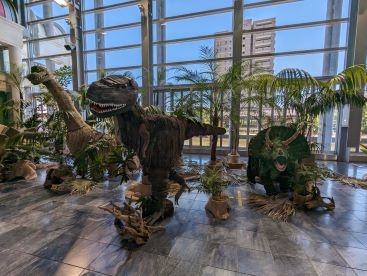 ジーンズストリート向かいにある市民交流センターの展示スペースには 迫力ある恐竜が展示されています