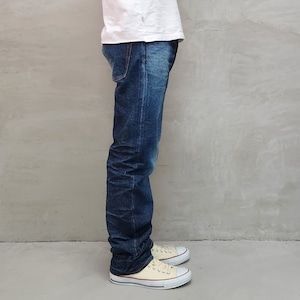 15オンスのオリジナルセルヴィッチデニム生地(赤耳)を使用。BLUE SAKURAの代名詞のひとつともいえる人体から型どる立体加工が最大の特徴。立体加工の上から、職人が手作業でさらにシェービングを入れて、よりリアルなヴィンテージ感を演出しています。