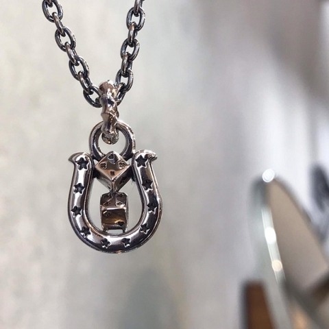 ラッキーモチーフとして知られるホースシュー(馬蹄)と2つのダイスを組み合わせたペンダント。