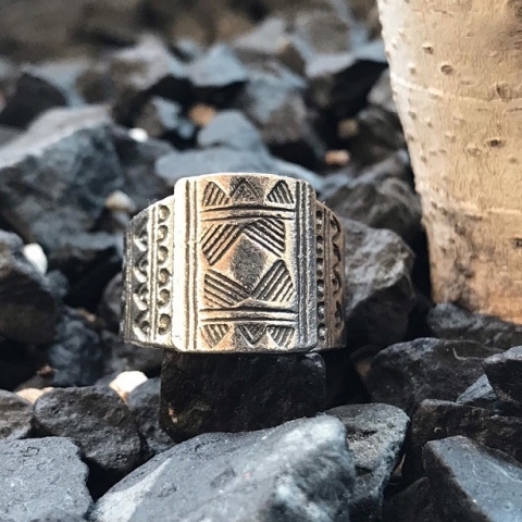 シールド(盾)を思わせる前面の長方形デザインが印象的なカレンシルバーのリングです。