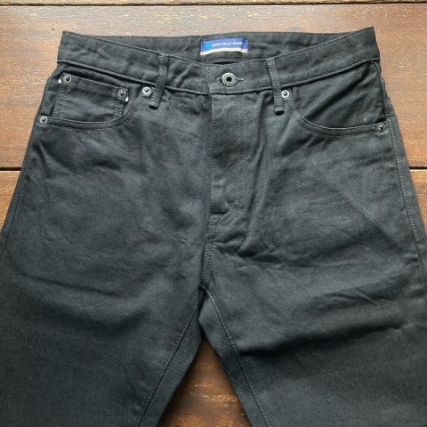 経緯ともに硫化染色の糸を使用した、深みのあるブラックジーンズです。