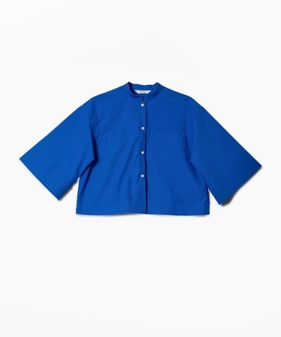 襟と袖口に細かいステッチと胸元のポケットのデザインがアクセントのショート丈のシャツ。