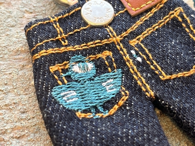 omotodenimの人気キャラクター「おもとり」が、バックポケットにちょこんと刺繍されている遊び心満点のデザイン!