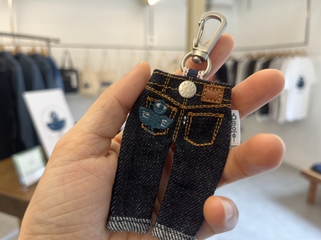 バックポケットに愛らしい“おもとり”の刺繍が施された、ミニジーンズ型キーホルダーの再入荷です。