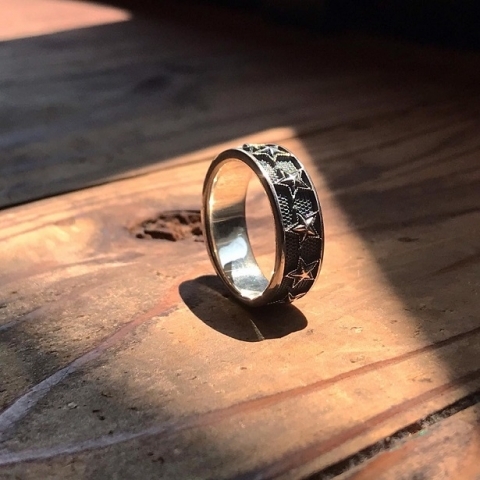 メカジスタイルに相性バツグンな、ハチの巣柄をバックにスターが並ぶポップで遊び心のあるリング。