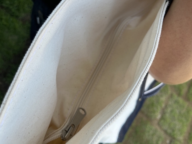 たっぷりのマチと内ポケットのおかげで整理もしやすく、上部にはジッパー付きのカバーも。中身が見えず、急な雨風や移動の衝撃でも安心です。