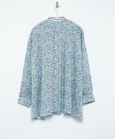 タナローン生地のくすみがかったブルーグリーンをベースに斑点と東洋の花が描かれたデザインと、ブルーや紫などの小花をラフなタッチで描いたデザインを使用。