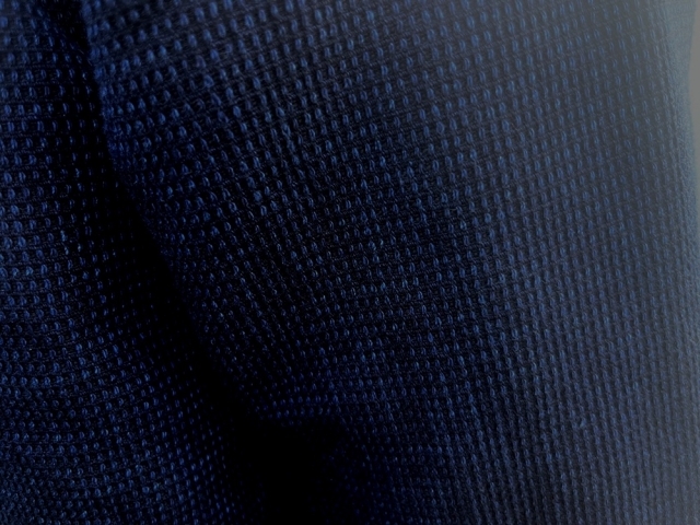 今回のHAPPIは、経糸にインディゴ、緯糸に黒の糸を掛け合わせ、深みのある色合いを表現。さらに刺子風の織りで生地表面を立体的なキューブ型に仕上げ、独特の凹凸感と豊かな表情を持たせました。
