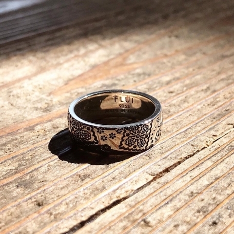 全体にペイズリー模様を散りばめた、遊び心と存在感のある甲丸リング。