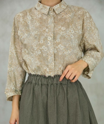 リバティプリントを日常に気負わず楽しめる、襟付きの七分袖シャツ。