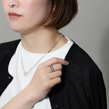 重ね付けしなくても存在感があり、カジュアルからモードまで幅広いスタイリングに馴染むアイテムです。