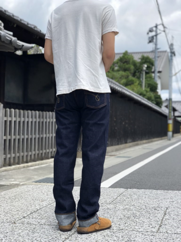 穿く度にメリハリのある綺麗な縦落ちをする生地を作るため、通常7番手の経糸を使用する事が多い14ozの生地に、それよりさらに太い6番手の糸を使用し、生地のムラを強調しました。
