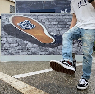 本日は、ジーンズストリートにあるトイレの壁の前で撮ってみました❗