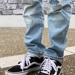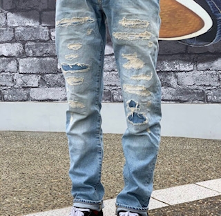 淡い青色と激しめの加工感が魅力のこの一本。生地は薄く、ストレッチも効いているので、