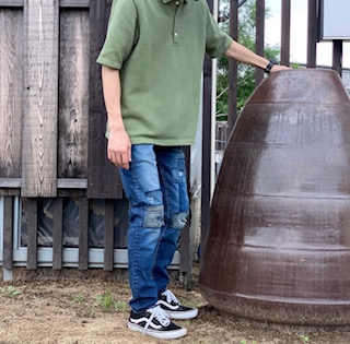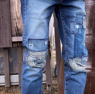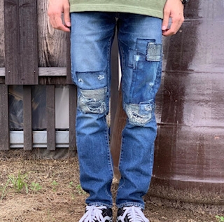 深々とした青に、コテコテなリメイク加工を施した一本。リメイク部分の、”刺し子” ”コーデュロイ”が魅力的です。