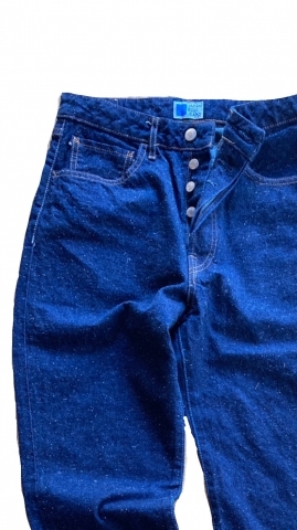 こちらのジーンズ、経糸はインディゴ染めを施した糸を使用し、緯糸にバナナの繊維とコートジボワール綿を混ぜて糸にしたものを使用しております。