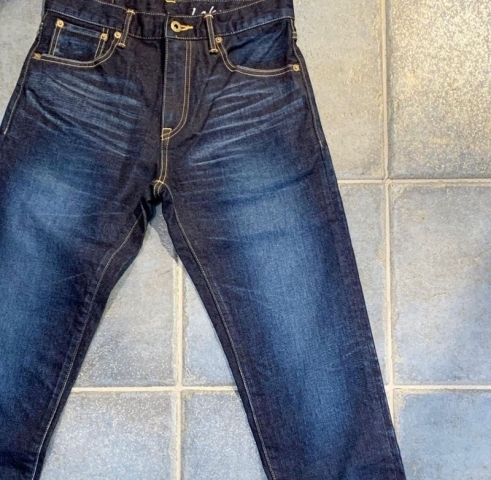 ダメージ無し、色落ち加工のみの濃いめのお色で、シルエットは、スッキリとした細身のストレートモデル。