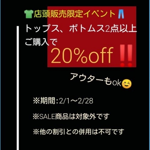 店内のトップスorボトムス定価商品2点以上お買い上げで20%OFF‼(アウターもOK)
