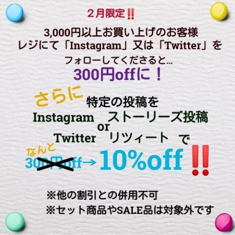 児島店or倉敷店で3,000以上のお買い上げのお客様は、レジにて「インスタグラム」or「ツィッター」