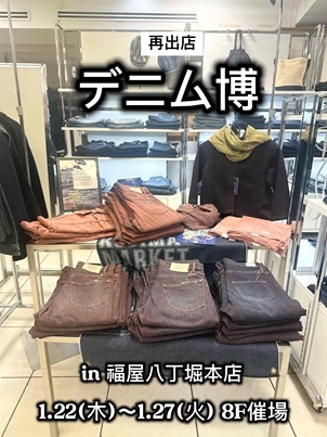 催事出店のお知らせ♪ 本日より、広島県の福屋八丁堀本店にて『デニム博』を開催致しております。 お近くにお越しの際は、是非お立ち寄り下さいませ。 場所: 本店8階催場 期間:2026/1/22(木)〜1/27(火) 時間:10:30~18:30(最終日17:00まで)