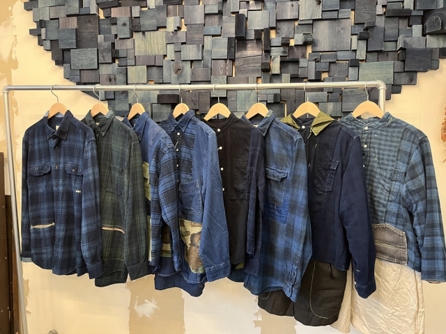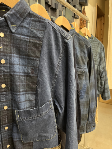 今回入荷したシャツとコートは、ヴィンテージのフランネルシャツを解体し、別のシャツ同士や異素材と組み合わせて再構築したもの。