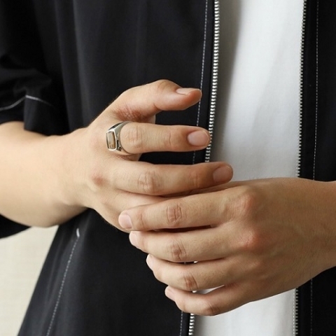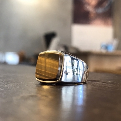 中央に高さのある天然石を埋め込んだ印台型のリング。