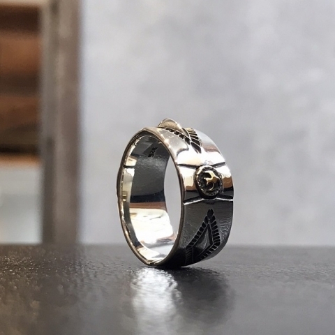 立体的なひし形と、ブラス(真鍮)製のイーグルメタルが交互に配置されたリングです。