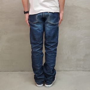 15オンスのオリジナルセルヴィッチデニム生地(赤耳)を使用。BLUE SAKURAの代名詞のひとつともいえる人体から型どる立体加工が最大の特徴。立体加工の上から、職人が手作業でさらにシェービングを入れて、よりリアルなヴィンテージ感を演出しています。