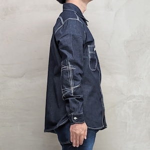 厳選の10オンスデニムを使ったヴィンテージ仕様デニムシャツ。トリプルステッチ、空環仕上げなどアメリカンカジュアルのヴィンテージ仕様を取り入れつつ、ヒジ裏にあて布を貼り付けランダムステッチを施すなど、BLUE SAKURA独自のデザインも目を引きます。