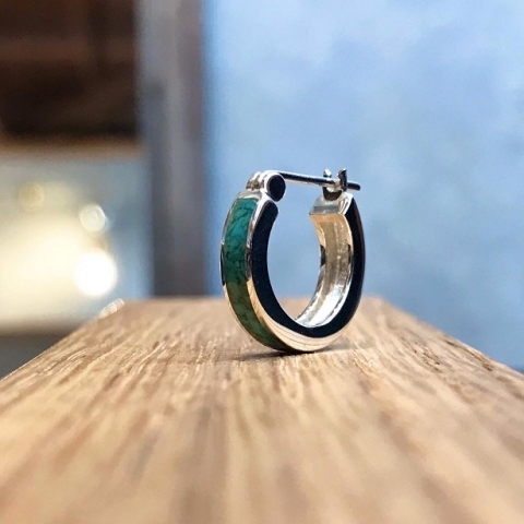 シンプルなフープピアスの前面にクラッシュターコイズを埋め込んだフープピアス。