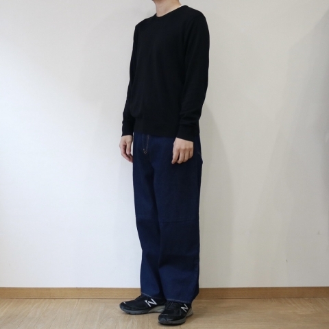 ジーンズのディテールながらシルエットはジーンズらしくない膝に切り替えの入ったボリュームのあるシルエット。