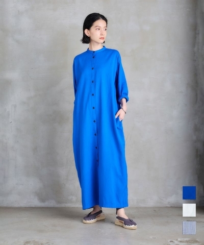 バンドカラーで首元はすっきりと、バックには大きくスリットが入っているから軽やかな印象に。