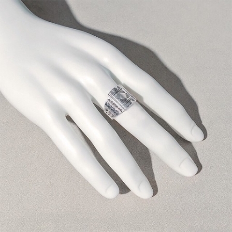 シールド(盾)を思わせる前面の長方形デザインが印象的なカレンシルバーのリングです。