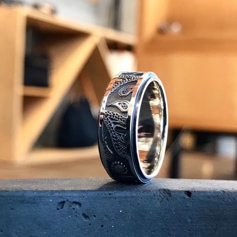 燻しの黒が醸し出す無骨な雰囲気はデニムなどのカジュアルコーデとの親和性も高く、悪目立ちせずこなれ感を出せるリングです。