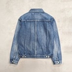 1stタイプのGジャンをモチーフにしたデニムジャケットだが、シンチバックをなくしたり、本来特大サイズのみにある背中のTバックディテールを全てのサイズにおいてデザインとして採用するなど、各ディテールにこだわりを持たせている。