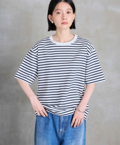 ゆとりのあるシルエットのクルーネックボーダーTシャツ。